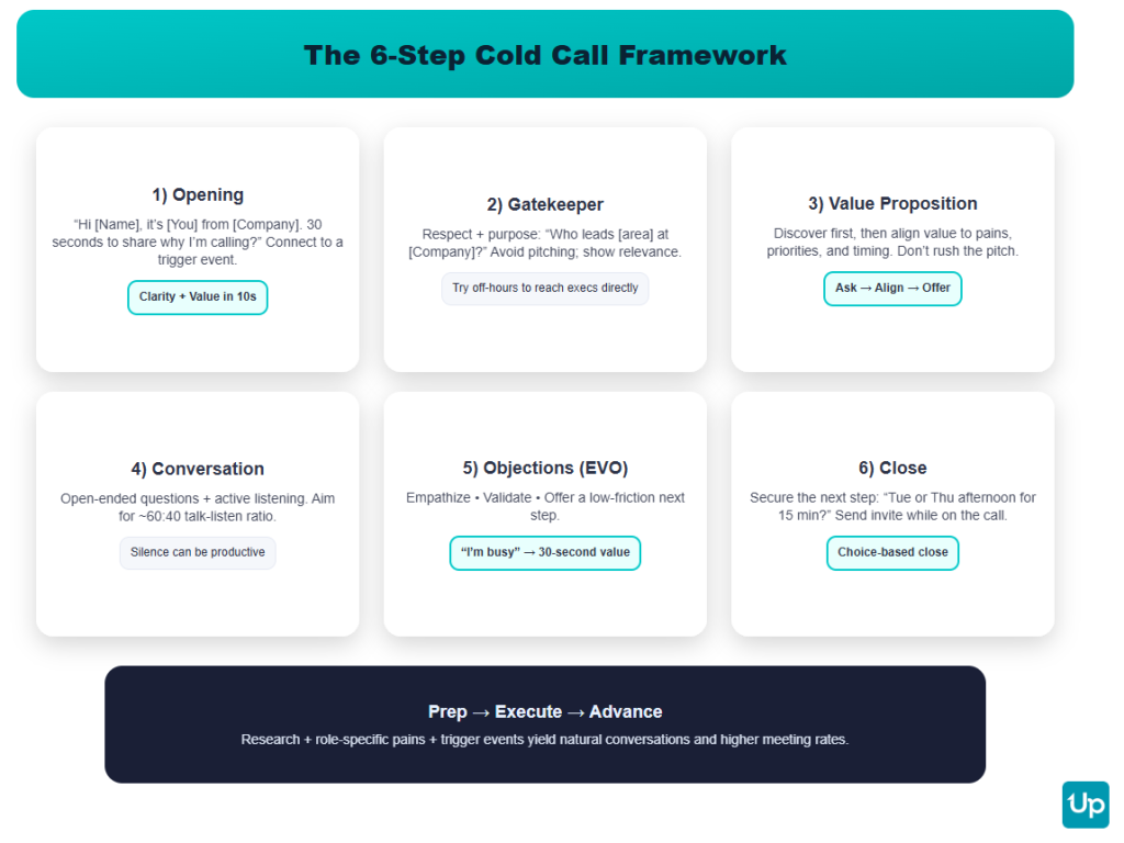 The actual call execution requires a structured approach that feels natural and conversational. This 6-step framework guides you through each stage while maintaining flexibility to adapt to your prospect’s responses and needs. Remember, a quick conversation or a short call can still be an effective cold call if it directly addresses the prospect’s needs and delivers value efficiently.