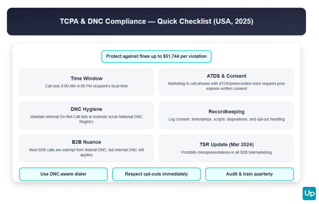 To stay compliant, use platforms that include DNC management features, respect call-time restrictions, maintain detailed records of consent, and regularly scrub your lists against the National DNC Registry.