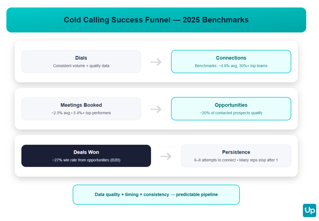The average cold calling success rate for booking meetings ranges from 2.3% to 4.82%, with data provider Salesgenie reporting approximately 4.8% success rate as of 2024. It takes an average of 6-8 attempts to reach a single prospect, meaning you might need 20-40 total calls to book one meeting. Top-quartile reps need only 8 cold calls to get one conversation, compared to 19 calls for average reps.