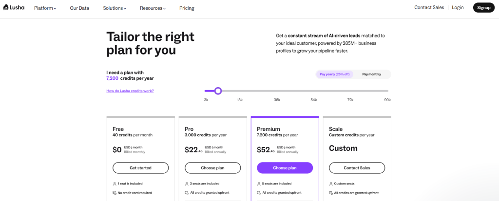 Lusha starts at $29 per user per month with a free plan that includes limited credits. The platform focuses on contact details and phone numbers with a simple UI designed for speed. Lusha specializes in direct dials and mobile numbers with browser extension access.