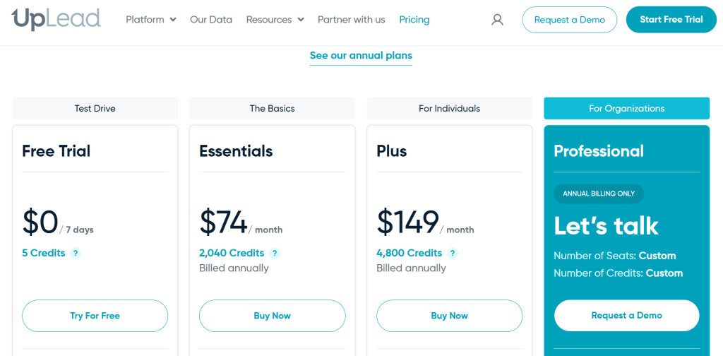 UpLead | credit-based tiers | $74 monthly billed annually | yes | 95% email verification • mobile direct dials • intuitive interface • fast exports to CRM | SMB and mid-market teams that want transparent plans and fast lead generation |
