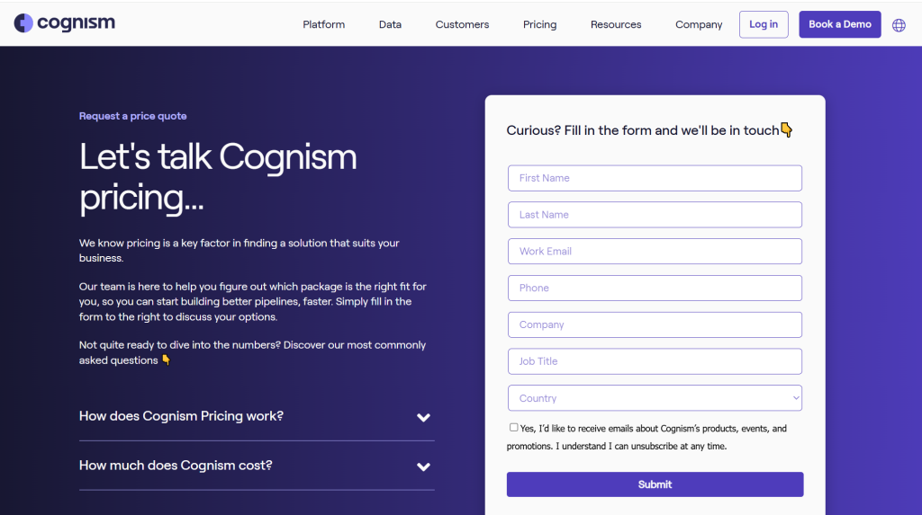 Cognism uses quote-only pricing with no public rates. The platform specializes in phone-verified mobile numbers and compliance-focused data collection, particularly strong in EMEA markets. Cognism emphasizes GDPR compliance and intent data.