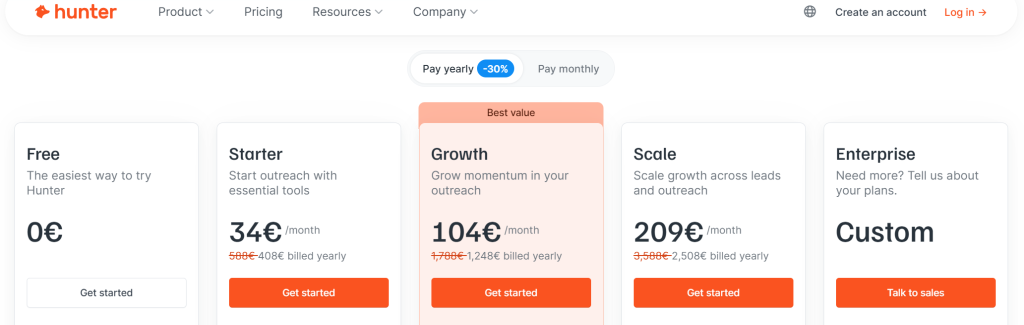Hunter.io starts at $49 per month with credit-based tiers and a free plan. The platform focuses on email discovery and verification with domain search capabilities and a simple API. Hunter specializes in finding email patterns and verifying addresses.