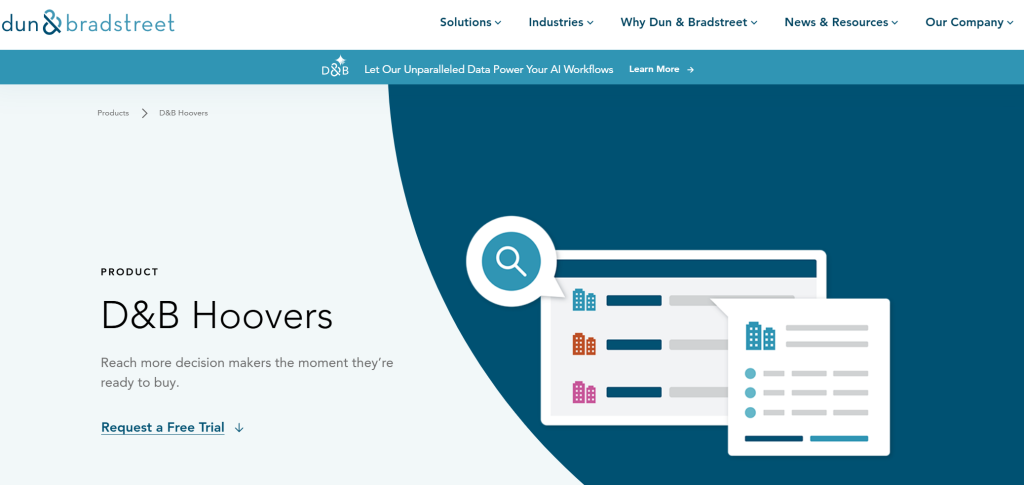 D&B Hoovers pricing uses a public monthly plan and custom enterprise quotes. Essentials costs $49 per month with 150 monthly credits and a free trial is available. Custom plans scale based on user count, data access, and advanced features. Dun & Bradstreet powers the Hoovers database with over 500 million companies and 497 million contacts from the Bradstreet Data Cloud. Sales and marketing teams use it for sales prospecting, targeted lists, and dynamic list building capabilities with accurate data to reach decision makers.