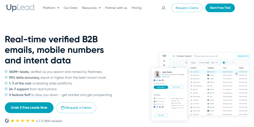 UpLead is a B2B contact provider and offers real-time access to over 160 million verified B2B contact profiles, UpLead allows small and mid-sized businesses to scale lead research on a budget. Features like email verification, advanced search filters, and guaranteed 95% data accuracy power targeted prospecting, while a free trial option allows testing the intuitive contact database firsthand. For affordable yet reliable business intel with no strings attached, UpLead provides immense appeal for resource-conscious sales organizations. Try it free today and find the prospect’s contact information with one of the top-tier sales tools on the market.