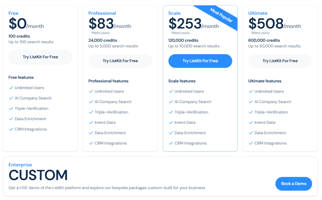 With a database of 731m+ triple-verified leads, ListKit is a very popular B2B sales intelligence tool used by countless companies worldwide. One of the most important decision points for any business is pricing – whether you’re just starting out or are a global enterprise, it’s important to choose a platform that makes sense for your team’s budget.