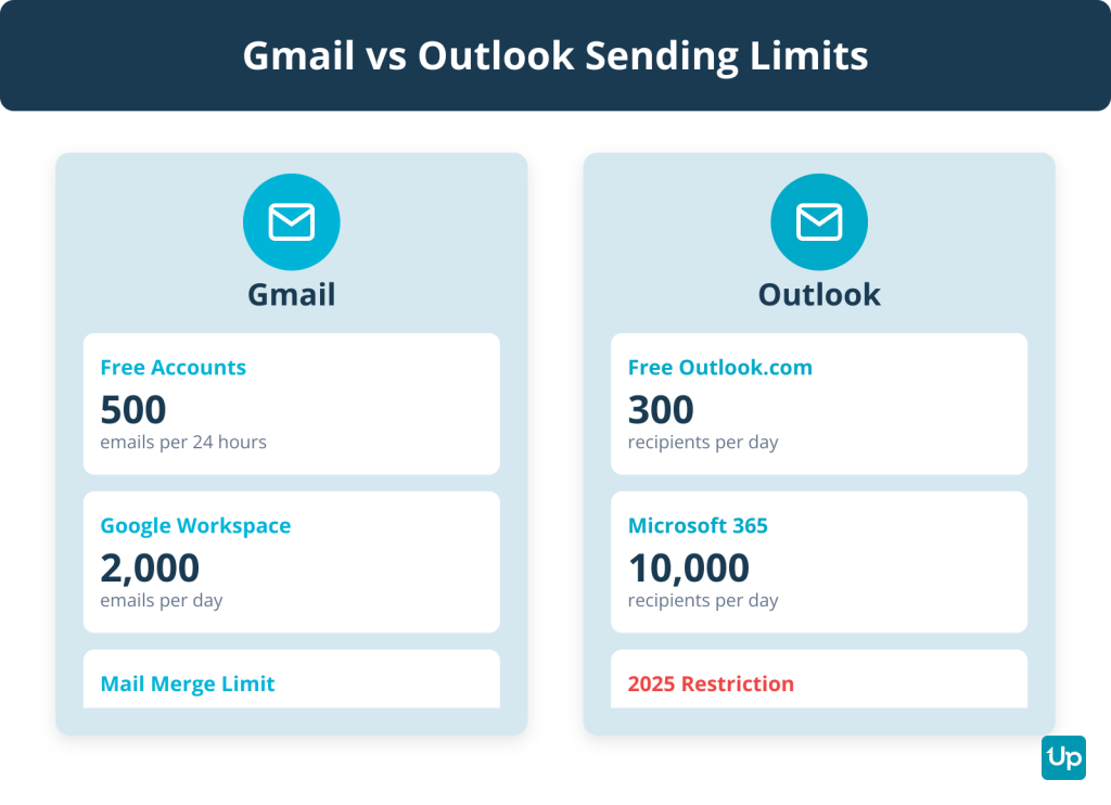 Both platforms impose strict sending limits. Free Gmail accounts allow you to send to only 500 recipients in a rolling 24-hour period. Paid Google Workspace accounts increase this limit to 2,000 emails per day per user. Free Outlook.com accounts limit you to 300 recipients per day. Paid Microsoft 365 accounts allow up to 10,000 recipients per day but with a new restriction starting January 2025: only 2,000 of those can be external recipients.