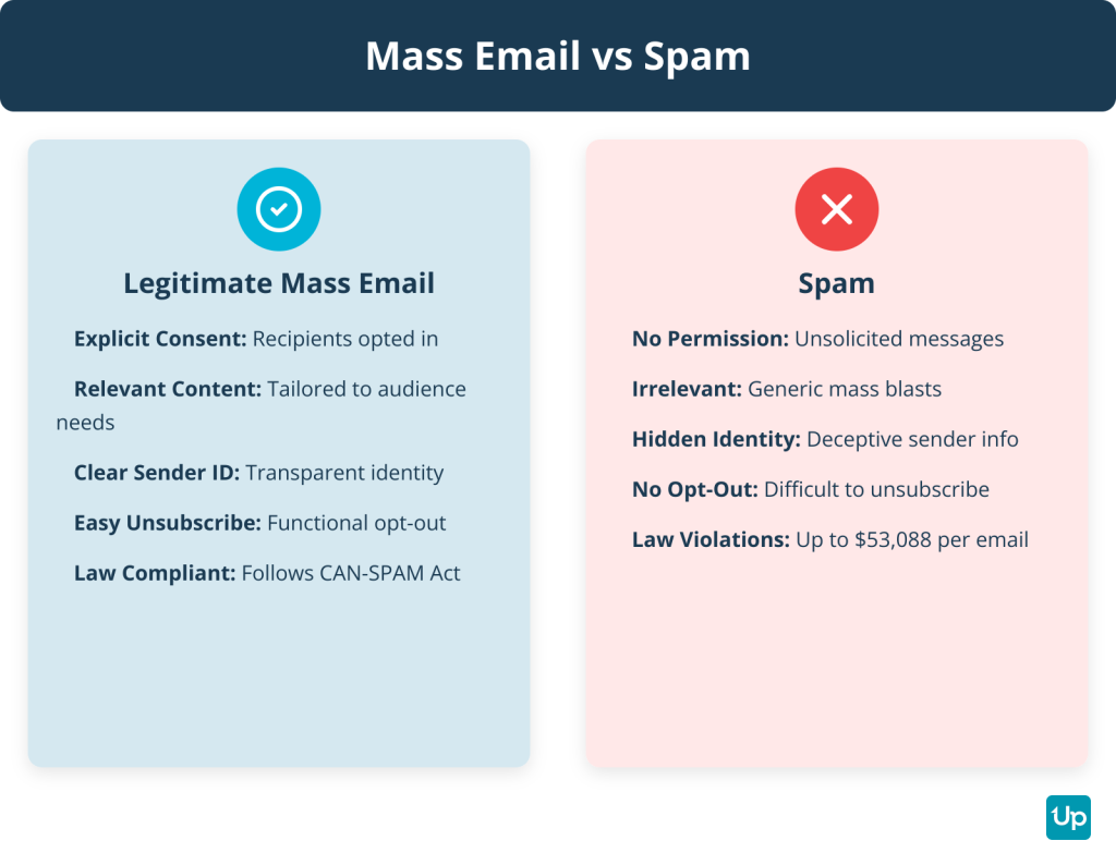 Yes, mass email is legal as long as you comply with spam laws. These laws usually ask users to add an opt-out feature and not to sell data collected from mass email sending. As of 2024, each separate email that violates the CAN-SPAM Act is subject to penalties of up to $53,088.