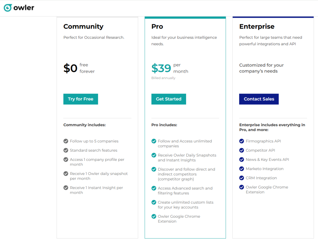 Owler offers a range of pricing plans catering to different needs and budgets. Pro is billed annually; Enterprise is custom; Community is free.
