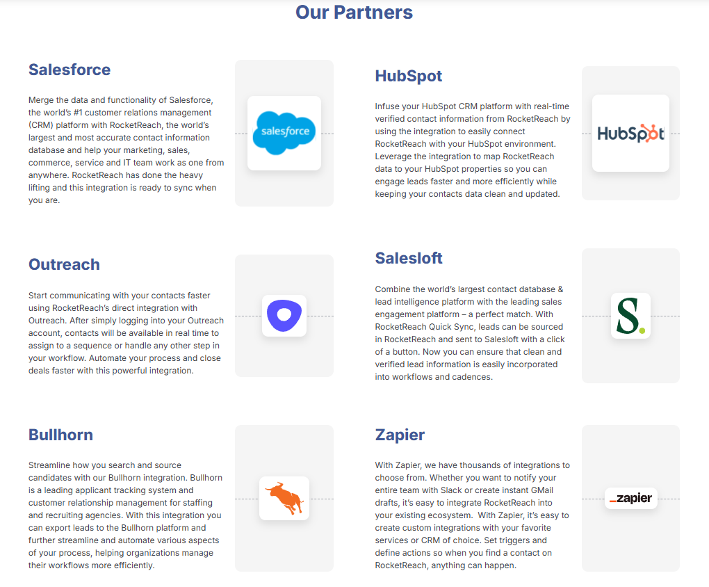 RocketReach also offers direct integration with the popular CRM platform HubSpot. You can easily connect the sales intelligence tool with the HubSpot environment. Verified contact information is sent in real-time to your CRM database. There are also direct integrations for Salesloft, Outreach, and Bullhorn.