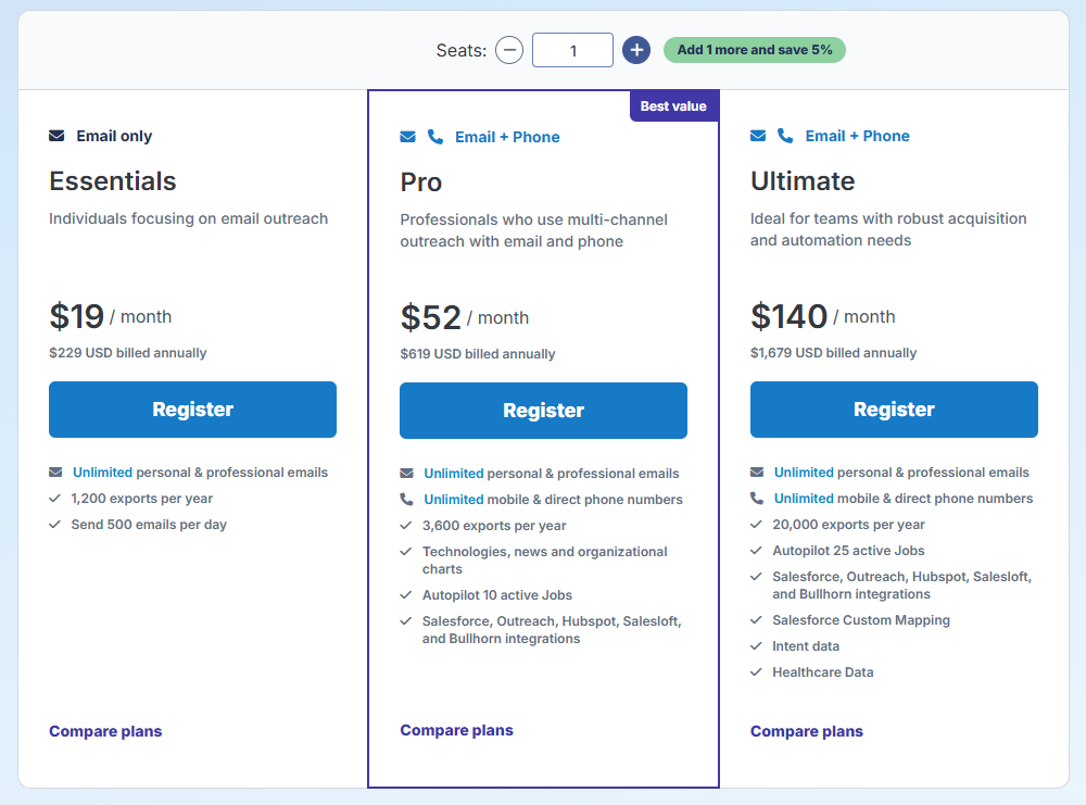 RocketReach has three per-seat plans: Essentials (Email only), Pro and Ultimate (Email + Phone). A free account (no card) includes 5 lookups.