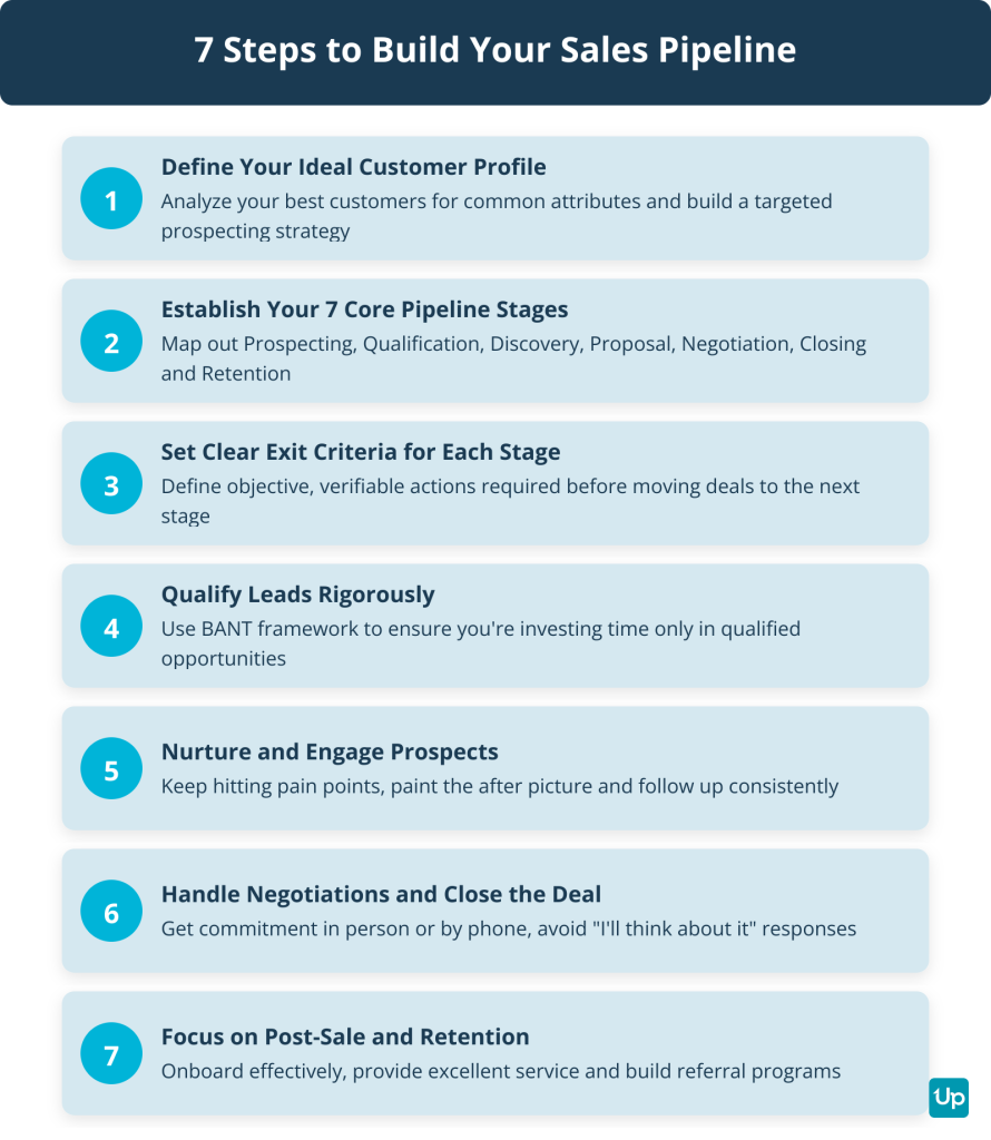 You build a sales pipeline in 7 steps by defining your ideal customer profile, establishing core pipeline stages, setting clear exit criteria, qualifying leads rigorously, nurturing prospects, handling negotiations and focusing on post-sale retention. Here’s how to do it in seven concrete steps.