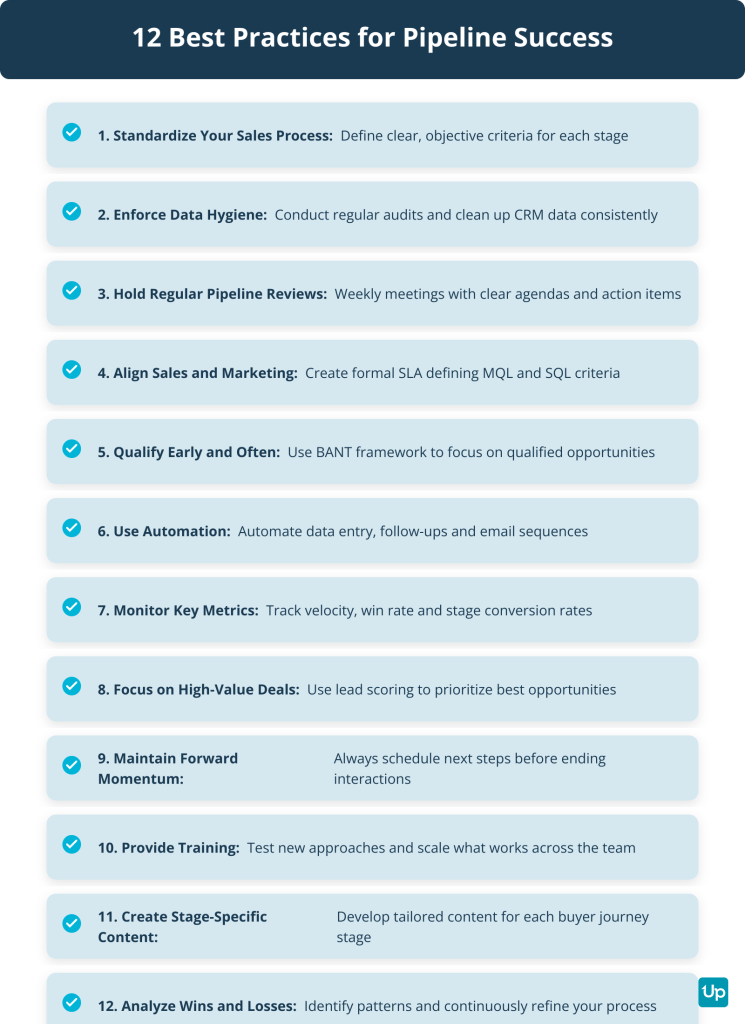 Define rules based on verifiable buyer actions for each stage. This prevents deals from stalling and keeps your pipeline accurate.