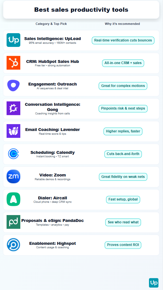 But what if you could reclaim those lost hours? The same Salesforce report found that 83% of sales teams using AI saw revenue growth last year, proving that the right tools are a critical differentiator. From my experience building UpLead and working with thousands of sales professionals, I can confidently say that the right sales productivity platform can transform a struggling team into a revenue-generating machine. This comprehensive guide shows you exactly how to automate repetitive tasks, streamline your workflow, and empower your team to focus on what they do best: selling.
