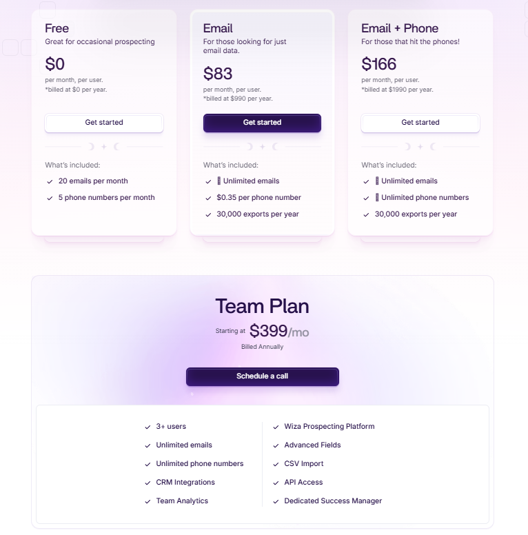 Wiza has a Free plan (20 emails/mo, 5 phones/mo). Paid plans are per user. Monthly plans include set quotas with overages at $0.15/email and $0.35/phone; annual plans provide unlimited credits with 30,000 exports/year on individual tiers.