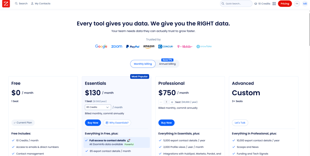 ZoomInfo also offers ZoomInfo Lite, a separate product for small teams and individuals, starting at $0 for the free plan, with paid plans ranging from $130/month (Essentials) to $750/month (Professional), plus custom pricing for the Advanced plan.
